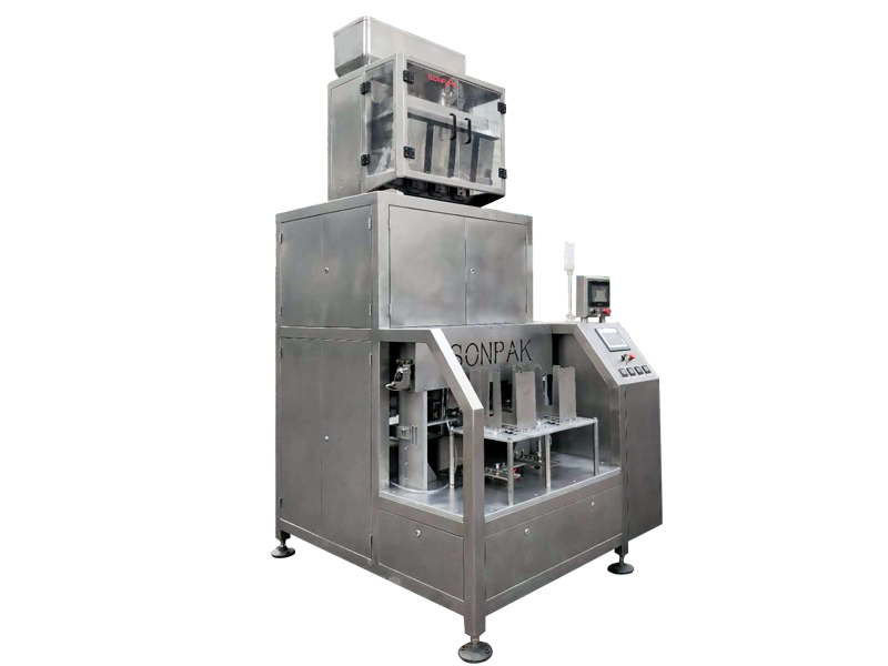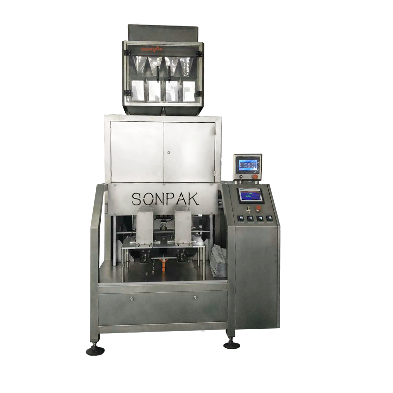 1、該真空包裝機(jī)將成品袋按順序放到指定袋庫(kù),該機(jī)自動(dòng)完成:取袋-開(kāi)袋-裝料-整形-抽真空-封口-成品送出。