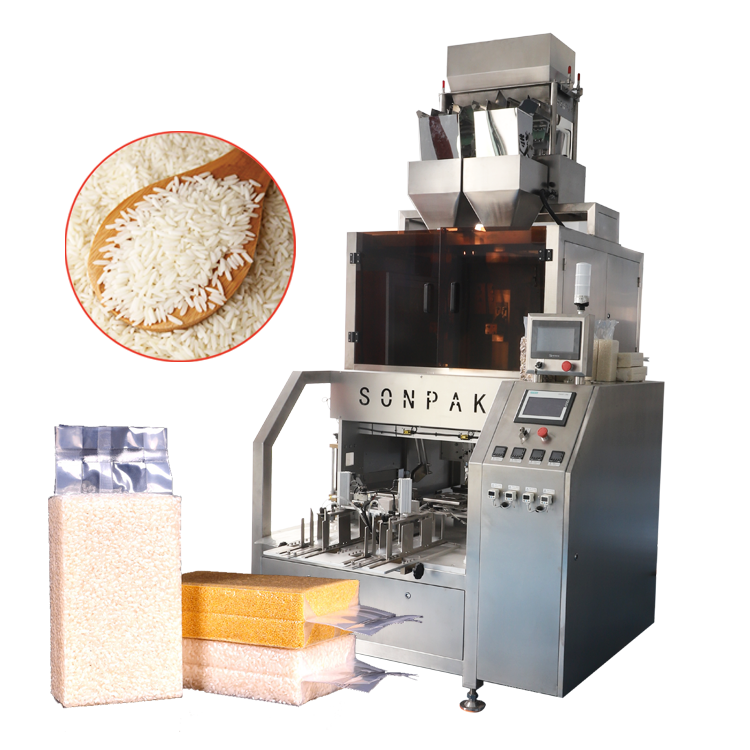 3、自動(dòng)大米真空包裝機(jī):將完成裝袋后的半成品經(jīng)包裝機(jī)送入該機(jī)中整形、抽真空并自動(dòng)封口